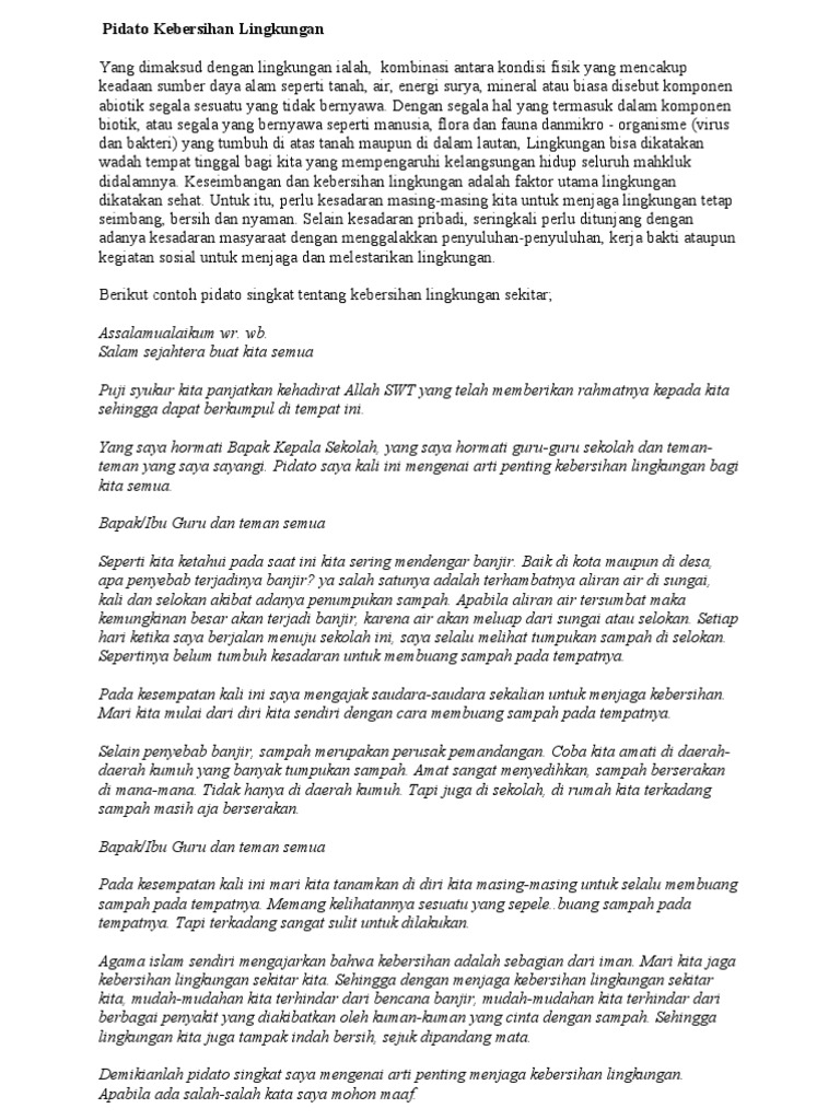 Namun ada dua tiga paragraf yang itu merupakan hasil kreasi dan buatan saya pribadi. Syukur dengan hati yaitu menyadari dan menyakini bahwa semua nikmat dan karunia yang diperoleh merupakan anugerah allah dan berasal dari nya. Teks pidato tentang kebersihan lingkungan kami akan coba menyajikan pidato tentang kebersihan lingkungan untuk anda yang sedang mencari dan ingin berlajar tentang pidato berikut teks pidato tentang kebersihan lingkungan contoh teks pidato assalaamualaikum warahmatullaahi wabarakaatuh. Di sisi lain kesadaran masyarakat terhadap kebersihan masih sangat rendah sehingga pidato dengan topik ini acap kali dipilih untuk disiarkan. Disediakannya tong sampah pasti selalu beralasan yaitu agar kita selalu membuang sampah pada tempatnya sehingga sekolah kita tidak seperti lapangan sepakbola yang habis digunakan sebagai konser ada banyak sampah yang tak.
