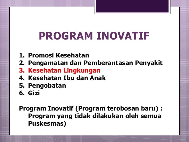 Inovasi program ukm di puskesmas agar terlaksana pada era jkn. Program inovasi ini diharapkan dapat bermanfaat untuk mendorong sikap peduli dan cinta lingkungan baik bagi pengguna layanan maupun penyedia layanan untuk menciptakan lingkungan puskesmas yang bersihtertibamansehat dan indah. Alasan kami ingin membahas ukm adalah karena saat ini ukm akan terdesak. Keputusan kepala puskesmas pacet kabupaten mojokerto. Karena pada hari yang berbahagia ini saya akan memberikan 15 contoh program inovasi desa. Menggandeng pihak lintas sektor sebagai partner yang selalu konstruktif dalam memecahkan masalah berikut beberapa inovasi kami dalam memutus mata rantai permasalah kesehatan.