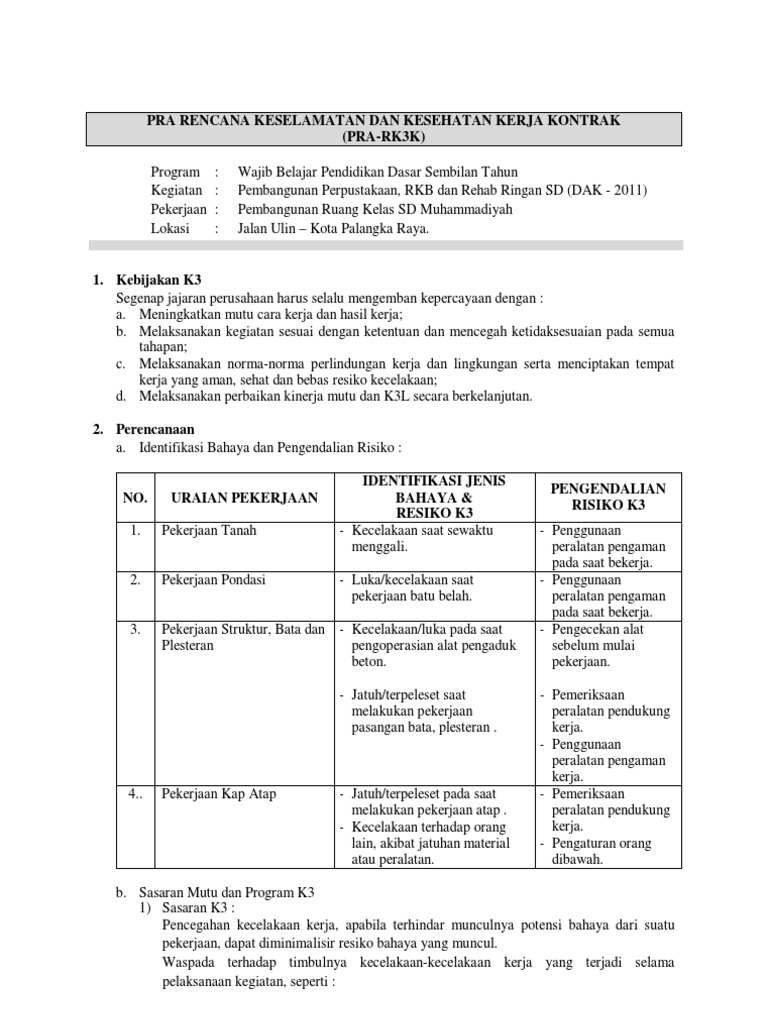 No ha r g a ju m lah sa t u a n. Menetapkan tujuan merencanakan melaksanakan dan mengevaluasi sasaran dan program k3 kesehatan keselamatan kerja secara berkala agar selaras baik dengan perkembangan kondisi perusahaan peraturan atau standar yang berlaku dan harapan pelanggan. Untuk hal2 khusus di luar ketentuan umum contoh. Contoh pra rk3k pekerjaan jalan pra rk3k pekerjaan jalan salah satu aspek penentu dalam mengikuti lelang baik yang melalui e proc atau non e proc adalah pembuatan rencana k3. Sasaran dan program k3. Formulir request yang sudah diisi 3.