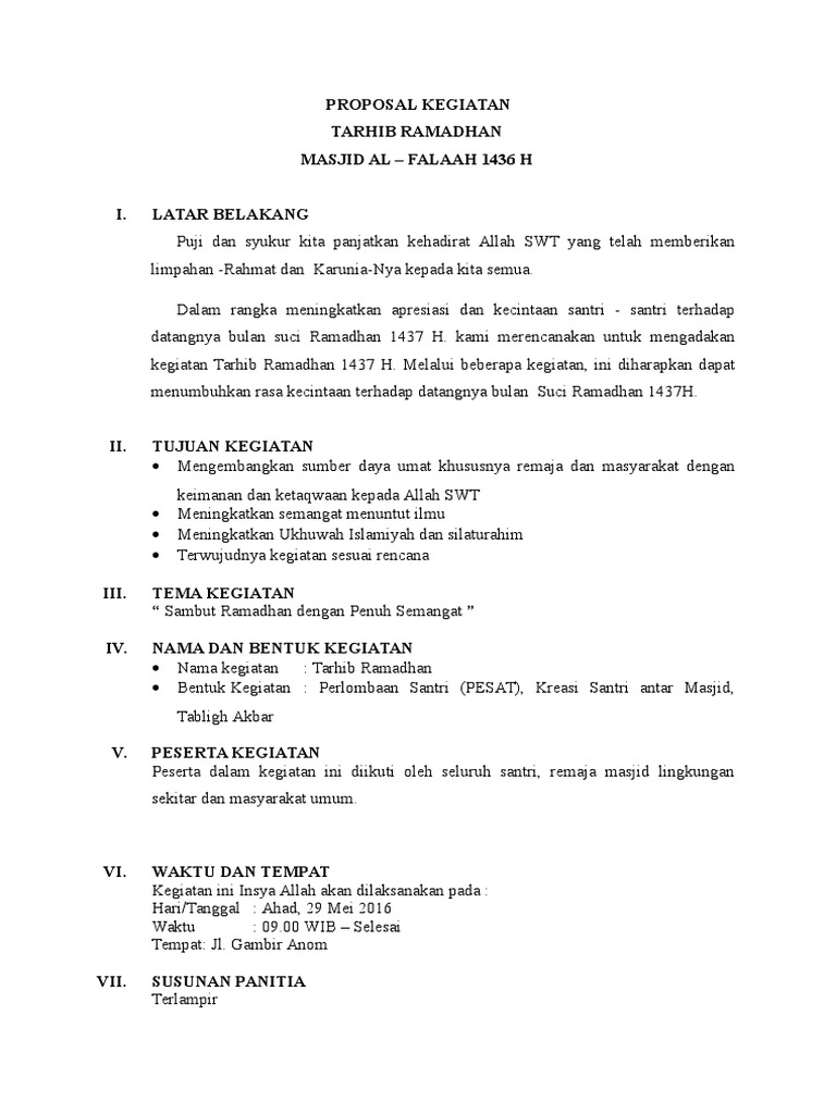 Contoh proposal kegiatan ramadhan di masjid pada kesempatan kali ini saya akan memberikan contoh pembuatan proposal untuk kegiatan bulan suci ramandhan yang baik dan benar. Sembilan belas tahun usia smp negeri 2 puhpelem dalam mengabdikan diri di bidang pendidikan merupakan usia yang panjang dan matang bagi sebuah lembaga pendidikan untuk mencapai predikat nama baik dan nama besar. Download contoh proposal kegiatan ramadhan proyek proposal kegiatan ramadhan masjid adz dzakirin blindungan bondowoso tahun 2019 m1440 h a. Demikian proposal kegiatan ramadhan ini kami susun untuk memberikan gambaran mengenai ramadhan nature camp 1431 hijriah payisc al azhar. Besar harapan kami semua pihak dapat ikut bekerjasama dengan kami sehingga melalui kegiatan ramadhan nature camp dapat memberikan pengalaman yang menyenangkan dan bermanfaaat bagi anak anak. Kegiatan akan berlangsung di masjid at taqwa kp.