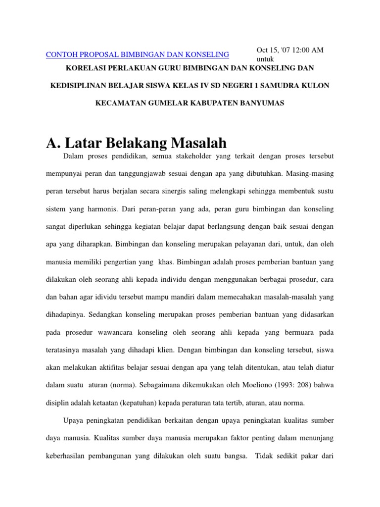 Contoh proposal skripsi bimbingan dan konseling. Imron rosyadi mahasiswa fakultas dawah universitas islam negeri sunan kalijaga yogyakarta jurusan bimbingan penyuluhan islam tahun 2007. Program bimbingan pribadi dan sosial untuk meningkatkan penyesuaian sosial siswa penelitian pra eksperimen terhadap siswa kelas xi sman 1 lebak tahun ajaran 2013 2014. Pencarian judul judul skripsi untuk jurusan bimbingan dan konseling terkadang tidak mudah. Contoh proposal skripsi a. Contoh skripsi bimbingan dan konseling untuk mendapatkan file lengkap dalam bentuk ms word mulai bab 1 sd. Contoh judul proposal ptk bimbingan dan konseling sebenarnya sangat mudah membuat judul ptk tinggal lihat situasi yang menarik yang pantas dan memenuhi syarat untuk di jadikan penelitian.