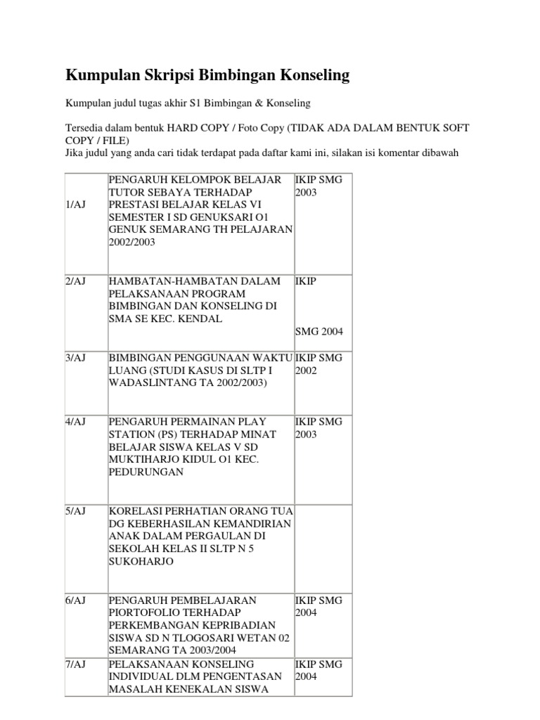 Untungnya di bawah ini ada ratusan judul skripsi bk yang bisa dijadikan inspirasi untuk pembuatan skripsi bk yang akan dilakukan. Macam macam judul ptk bimbingan dan konseling. Daftar pustaka bukan pdf silahkan klik cara mendapatkan file atau klik disini kirimkan ini lewat email blogthis. Koleksi skripsi ini dapetnya dari download di internet minta skripsi temen nyari2 di file rental komputer di seputaran kampus dan beli. Layanan bimbingan konseling selalu terdapat di setiap sekolah.