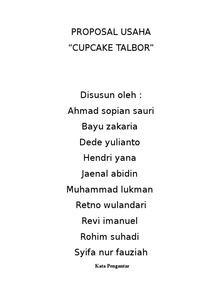Contoh proposal usaha ini bisa anda jadikan rujukan untuk membuat proposal. Proposal usaha cup cake. Kegagalan usaha sebenarnya bukan disebabkan oleh orang lain tetapi oleh diri sendiri. Berikut ini akan saya jelaskan sitematikanya disertai contoh proposal usaha. 1200 dan saya menginginkan keuntungan sebanyak 15 atau 180 per buah. Ketika ada seorang patiseri membuat kue cokelat dia lupa memasukkan baking powder ke dalam adonannya alhasil.