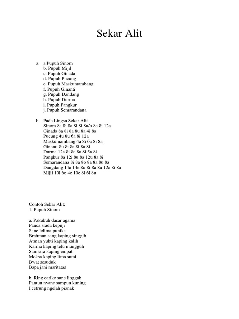 Ciri kental dalam geguritan adalah keberadaan pupuh yang membentuk geguritan seperti. Pupuh sinom iseng isengan manyurat 8i nanging sekare ka widhi 8a mangapus bharatayudha 8a. Berikut adalah beberapa teks yang bisa dilagukan untuk beberapa versi pupuh sinom sinom ludruk 1. Contoh sekar alit pupuh berikut ini saya sajikan tugas seni budaya saya yaitu membuat salah satu seni vokal bali yaitu sekar alit atau pupuh. Sekar rare juru pencar jenggot uban made cenik mati de. Ayu january 31 2019 at 303 am.