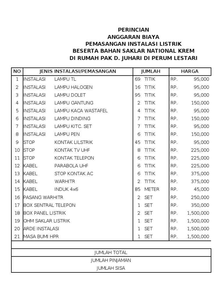 Contoh rab instalasi listrik. Berkomentarlah sepuas anda santun dan relevan by admin format administrasi desa. Dengan adanya daftar kebutuhan material seperti gambar di atas. Academiaedu is a platform for academics to share research papers. Rincian anggaran biaya rab pekerjaan pengadaan material dan jasa instalasi listrik sample villa lokasi tanjung pinggir sekupang pengadaan dan jasa uraian tunai. Karusel sebelumnya karusel berikutnya. Pada dasarnya format rab kegiatan di desa baik yang bersumber dari alokasi dana desa add dana desa dd bantuan keuangan kabupaten bantuan keuangan provinsi pendapatan asli desa atau sumber pendapatan lainnya harus mengacu pada peraturan perundang undangan.