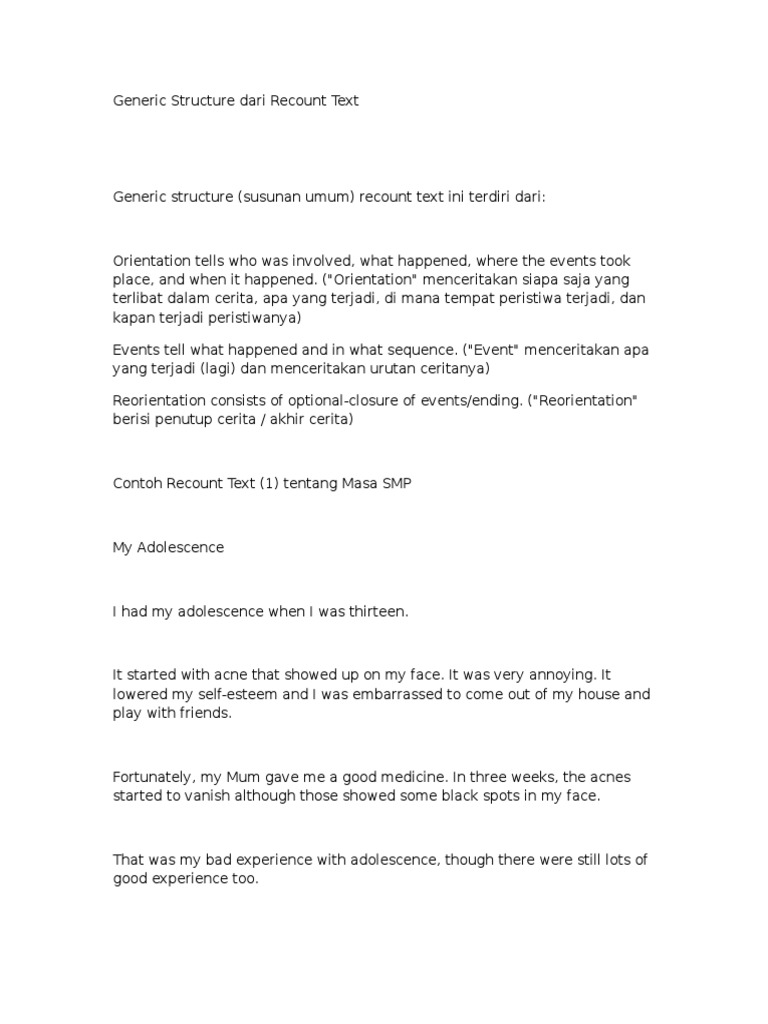 Contoh recount text tentang pengalaman di smp. Selamat menulis dan tetap semangat yah. Selain itu terdapat juga pembahasan tentang pengertian ciri ciri dan macam macam recount text. Artikel ini berisi materi tentang 23 contoh recount text lengkap beserta strukturnya. Jadi recount text bisa diartikan sebagai text yang menceritakan. Nah pada kesempatan kalli ini kbi akan membahas tentang recount text. Secara harfiah recount bermakna menceritakan.