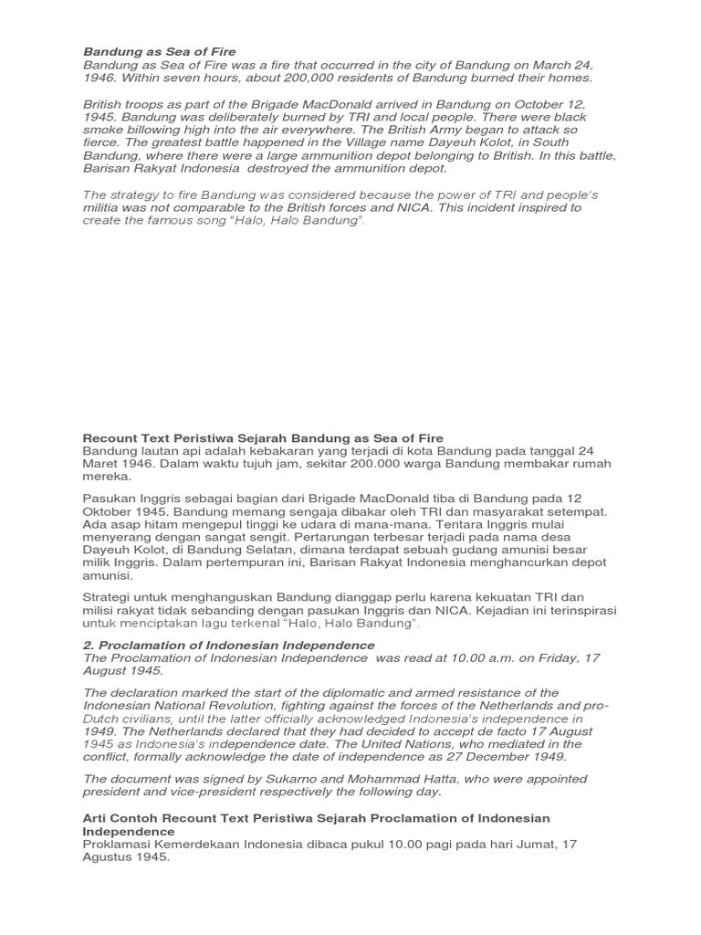 Contoh recount text tentang peristiwa bersejarah. Contoh recount text tentang peristiwa bersejarah indonesia artikel teks bahasa inggris tentang sejarah lengkap dengan terjemahan dan daftar kosakata baru by pustaka bahasa inggris posted on march 30 2019 november 2 2019. Setelah memahami bagaiman itu contoh teks recount maka kita. Kamu akan menemukan 23 contoh recount text dengan berbagai jenis dan tema seperti misalnya recount text holiday liburan recount text pendek dan singkat recount text tentang lebaran dan masih banyak lagi. Kbi juga telah memberikan contoh tentang narrative text dan procedure text. Purpose the purpose of recount text to tell or to retell events or experiences in. Contoh text recount di bawah terdiri dari beberapa contoh.