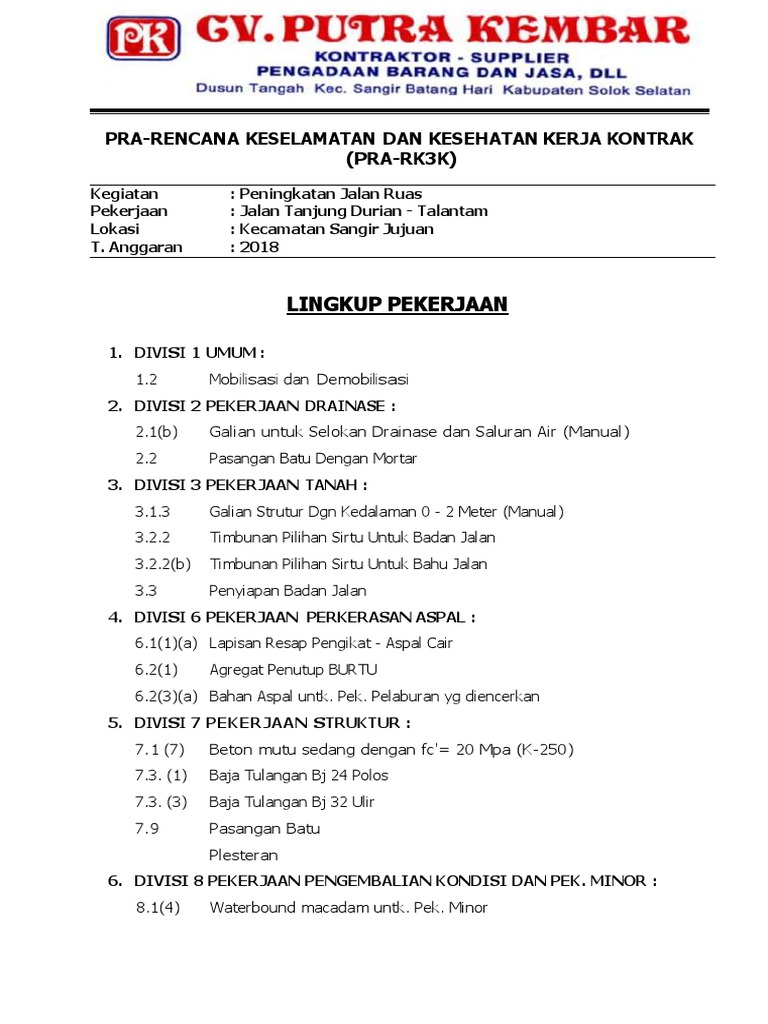 Contoh rencana keselamatan konstruksi penawaran. Menjaga kelestarian lingkungan hidup dan dalam rangka pemenuhan ohsas 180012007 butir 446 maka diperlukan suatu rencana program keselamatan dan kesehatan kerja di proyek. Rencana keselamatan konstruksi rkkdocx size. Pokja pemilihan dalam melakukan evaluasi terhadap rkk diatur dalam permen 142020 bahwa evaluasi terhadap persyaratan rencana keselamatan konstruksi rkk dalam elemen smkk dilakukan dengan kriteria penilaian ada atau tidak adaapabila salah satu elemen tersebut tidak ada maka dinyatakan gugursementara untuk evaluasi terhadap pakta komitmen berlaku sebagaimana telah. Rencana keselamatan konstruksi rkk rkk adalah dokumen lengkap rencana penerapan smkk dan merupakan satu kesatuan dengan dokumen kontrak suatu pekerjaan konstruksi yang dibuat oleh penyedia jasa dan disetujui oleh pengguna jasa untuk selanjutnya dijadikan sebagai sarana interaksi antara penyedia jasa dengan pengguna jasa dalam penerapan smkk. Bentuk rencana keselamatan dan kesehatan kerja kontrak rk3k i. Rencana keselamatan dan kesehatan kerja kontrak 2 rencana k3 kontrak rk3k rk3k adalah dokumen lengkap rencana penyelenggaraan smk3 konstruksi bidang pu dan merupakan satu kesatuan dengan dokumen kontrak suatu pekerjaan konstruksi yang dibuat oleh.