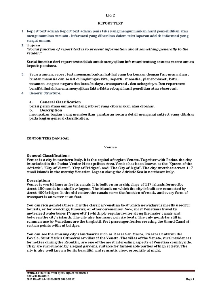 Demikian penjelasan report text. Contoh report text contoh report text 1 tentang kulit skin. Contoh report text report text merupakan jenis teks lain dalam materi bahasa inggris yang dibuat dengan tujuan mengumumkan hasil dari suatu penyelidikan atau mengumumkan sesuatu yang telah terjadi. In human being it is the largest organ of the system that covers our body. Baca juga tentang narrative text dan procedure text. Nantikan atikel lainnya dari kbi.
