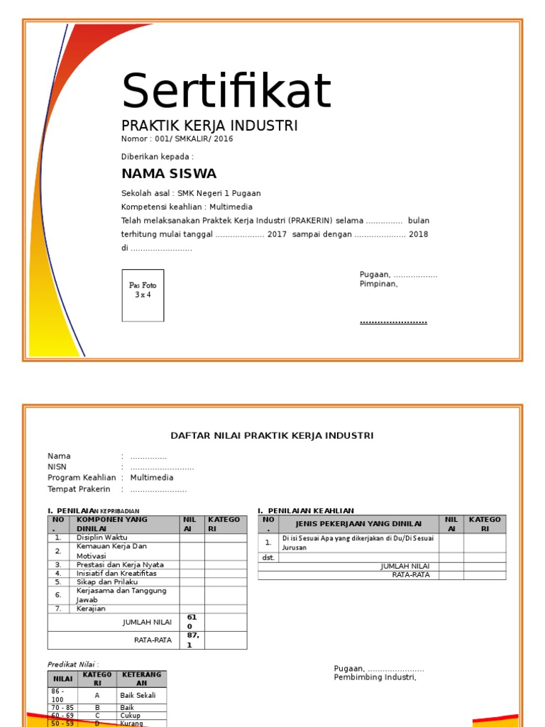 9997488156 no komponen yang dinilai daftar nilai angka dengan huruf kopetensi umum 1 disiplin kerja 75 tujuh koma lima 2 komunikasi dalam bekerja 85 delapan koma lima 3 motivasi kerja 80 delapan. Contoh sertifikat prakerin 1. Di akhir pelaksanaan pklprakerin siswa biasanya diwajibkan membuat laporan dalam bentuk karya tulis atau jurnal yang sudah ditentukan sekolah masing masing untuk diserahkan kepada pihak sekolah dan pihak industri sebagai dokumen. Contoh sertifikat prakerin pkl smk prakerin praktek kerja industri adalah kegiatan pendidikan pelatihan dan pembelajaran yang dilaksanakan didunia usaha atau dunia industri yang relevan dengan dengan kompetensi kemampuan siswa sesuai bidangnyadalam pelaksanaannya dilakukan dengan prosedur tertentu bagi siswa yang bertujuan untuk magang disuatu tempat kerja baik dunia usaha maupun. Sertifikat praktek kerja lapangan prakerin smk penilaian pkl penilaian pkl merupakan kewajiban mitra dunia usaha dan industri pemberian sertifikat pkl sertifikat dan aturan kerja magang bagaimana hukumnya sertifikat format vector cdr kompetensi sertifikat sertifikat pkl sertifikat pkl contoh sertifikat praktek kerja industri prakerin di pabrik tidak sama dengan prakerin rumahan atau cv. 0400 desain sertifikat pkl prakerin no comments.