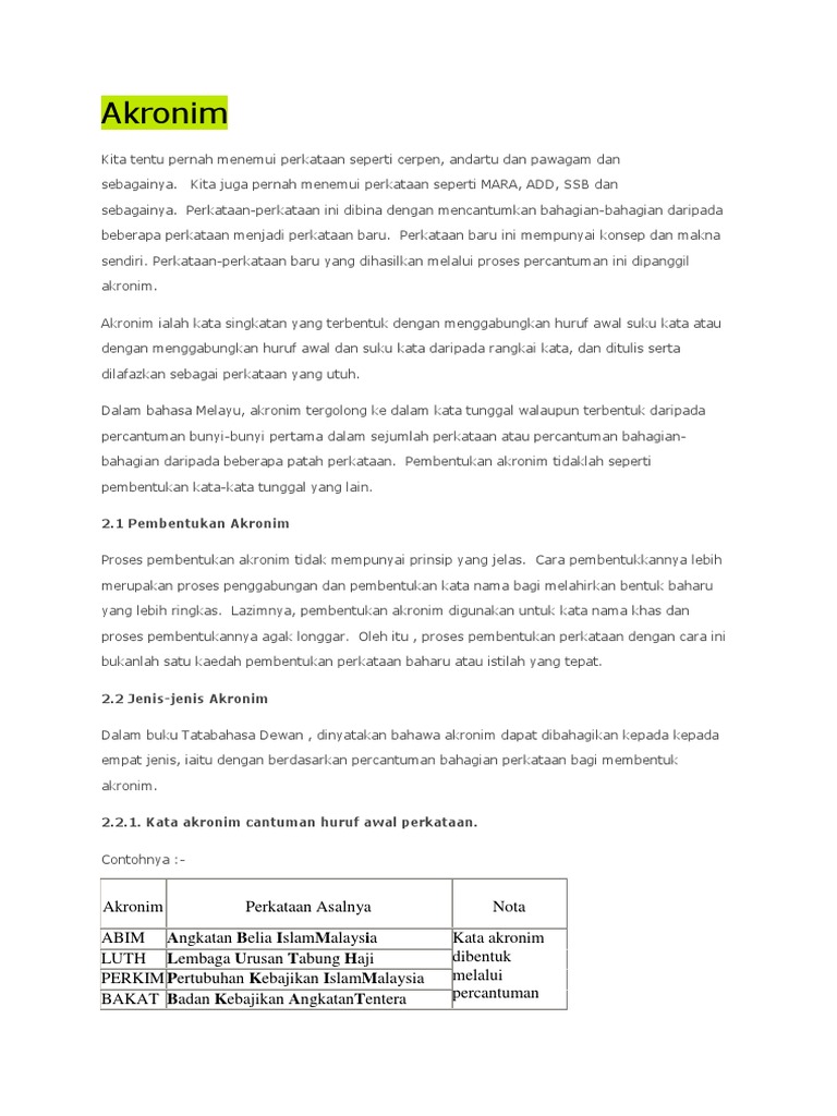 Akronim adalah singkatan yang mengambil dua atau lebih huruf dari kata yg disingkat diperlakukan sebagai kata contoh. Contoh bahasa sms di atas sangat membingungkan jika yang membaca tidak paham arti dari penyimbolan singkatan singkatan pada sms contoh dari akronim dan singkatan lainnya. Kata dasar dari akronim tersebut lalu menjadi kabur. Kapolrikepala kepolisian republik indonesia. Akronim dan singkatan merupakan sebuah pemendekkan kata yang memiliki perbedaan dalam penulisan dan pembacaan kata yang disingkatkannya. Karena akronim dan singkatan terdiri dari dua atau tiga huruf dapat memiliki kepanjangan lebih dari satu dalam bahasa bahasa yang berbeda.