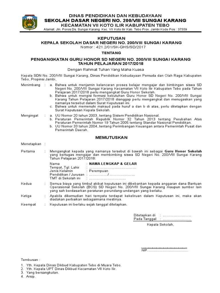 Contoh sk guru honorer 2019. Contoh sk guru honorer terbaru sd smp smasmk tahun 20192020 merupakan sebuah surat keputusan yang diberikan oleh kepala sekolah untuk memenuhi arsip administrasi atau sebagai bukti bagi gtt honor yang akan mengabdi di sekolah tersebutnah bagi anda yang ingin membuat sk namun tidak tahu caranya disini admin kan membagikan conoh sk honorergtt yang dapat anda unduh diakhir postingan ini. Sk ini digunakan untuk proses belajar mengajar sebagai inti dari proses penyelenggaraan pendidikan pada satuan pendidikan. Berjumpa lagi dengan kami disini. Sebelum menampilkan contoh sk pembagian tugas guru sk kbm ada beberapa hal yang perlu saya sampaikan. Contoh format sk pbm 20192020 merupakan informasi yang akan admin bagikan buat bapakibu mengenai sk pbm tahun pelajaran 20192020. Contoh sk guru honorer pada sekolah negeri oleh kepala sekolah terbaru 2019 kita sajikan tampilan langsung tanpa anda harus download atau unduh file maka anda sudah dapat memperoleh file penting tersebut tanpa repot download dan bisa langsung anda cek di bawah artikel ini.
