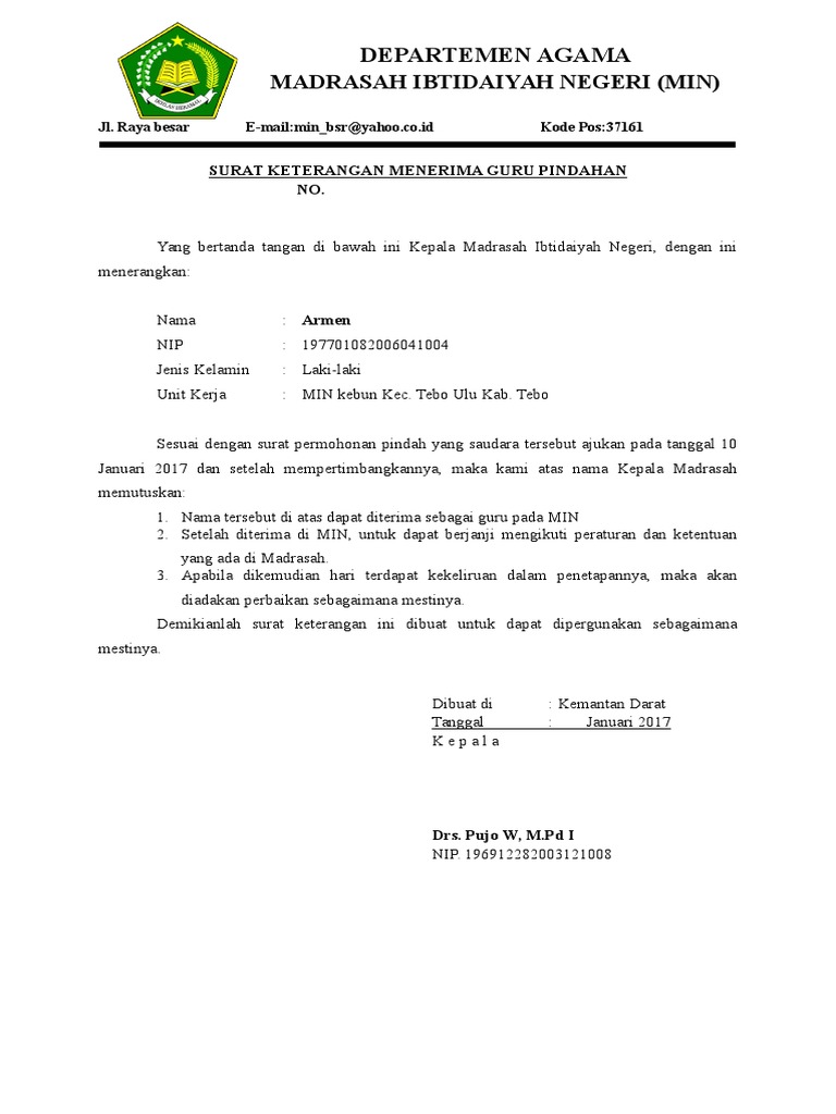Contoh sk mutasi guru honorer. Pengertian promosi promosi adalah penghargaan dengan kenaikan jabatan dalam suatu organisasi ataupun instansi baik dalam pemerintahan maupun non pemerintah swasta. Contoh dokumen permohonan mutasi guru bermula dari pengalaman pribadi untuk mengajukan permohonan mutasi dengan harapan mendekatkan diri dengan keluarga. Baik guru swasta ataupun guru honorer sama saja dimana mereka harus bisa melampirkan surat mutasi kepada dinas terkait. Hari ini saya akan membagikan kkumpulan contoh berkas mutasi guru pns antar sekolah yang mudah mudahan masih adanya yang membutuhkan guna arsip secara pribadi untuk melakukan mutasi atau pindah tempat mengajar. Terkadang jender pria wanita serta senioritas tua muda mempengaruhi keputusan tersebut. Contoh surat mutasi guru sd doc berikut adalah surat berupa file document yang dibagikan untuk kepala sekolah dasar yang sedang mencari dan akan menggunakannya untuk membuat surat mutasi bagi guru yang ingin memohon pindah dari sd asal ke sd yang baru perpindahan antar sekolah.