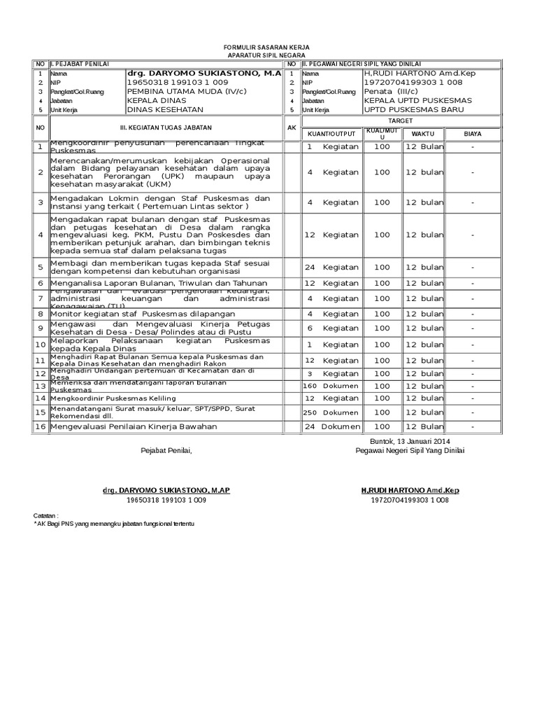 Dan berdasarkan perka bkn no. Pembuatan sasaran kerja pegawai skp wajib bagi setiap pegawai negeri sipil pns hal ini dijelaskan pada perka bkn nomor 1 tahun 2013 oleh karena itu melalui kesempatan ini kami mencoba memberikan contohnya yang mana pada pembahasan ini kami khususkan pada contoh sasaran kerja pegawai skp tenaga fungsional umum kesehatan. Kegiatan tugas jabatan ak target kuant output kual mutu waktu biaya 1 a. Sebelum membaca lebih lanjut ada baiknya membaca tulisan sebelumnya mengenai penilaian prestasi kerja pegawai negeri sipil dibawah ini. Saat ini istilah jabatan fungsional umum diubah menjadi jabatan pelaksana sesuai permenpan rb nomor 41 tahun 2018. Penyusunan dan penilaian skp bagi pns yang mutasipindah sebagaimana yang dicontohkan pada perka bkn no.
