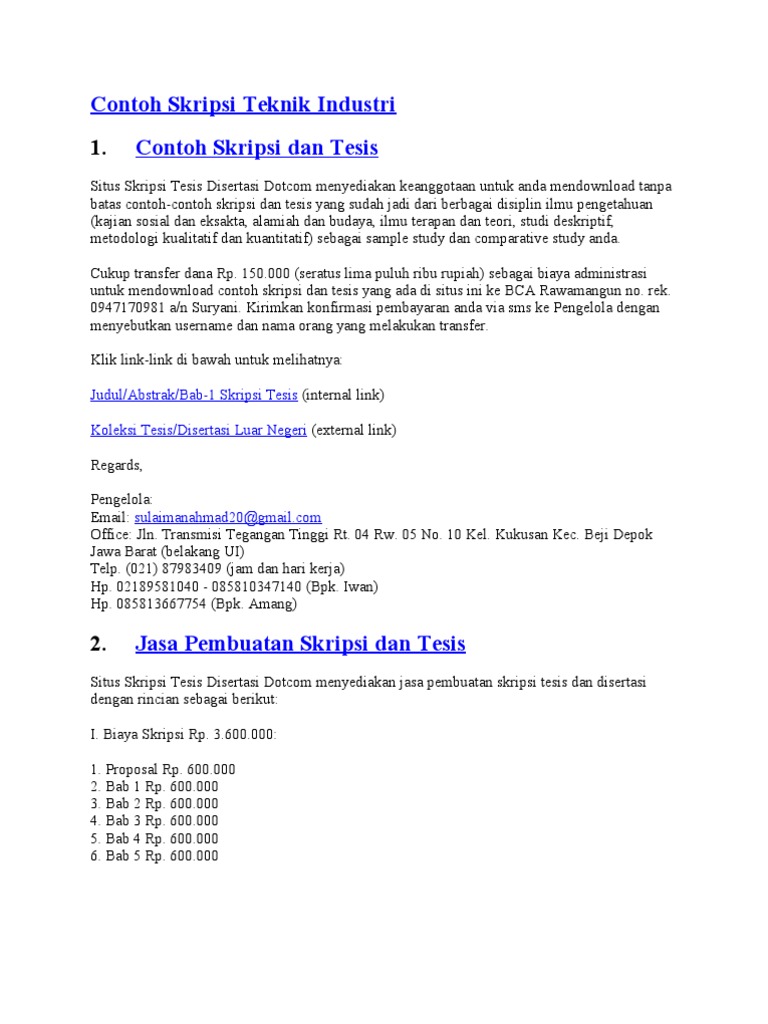 Contoh skripsi teknik industri. Contoh skripsi teknik industri semakin meningkatnya perkembangan hidup manusia maka era globalisasi pun ikut berkembang dengan pesat dengan munculnya beberapa perusahaan industri yang terus dibangun di kota kota besar seperti jakarta. Contoh proposal skripsi teknik industri tersedia banyak di katalog situs kami. Berbagi ke twitter berbagi ke facebook bagikan ke pinterest. Skripsi malang adalah jasa pembuatan judul skripsi teknik industri malang. Hal ini dikarenakan begitu luasnya penanganan yang berada dalam studi teknik industri. Jika kamu adalah salah satu mahasiswa tingkat akhir yang terserang galau karena judul skripsimu tidak kunjung acc atau bingung menentukan judul skripsi.