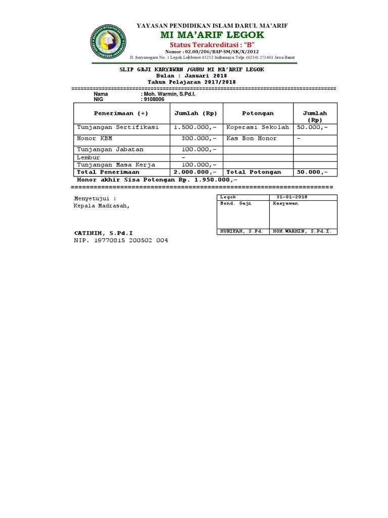 Contoh Slip Gaji Karyawan Terlengkap Guru Word Pdf Amp Excel