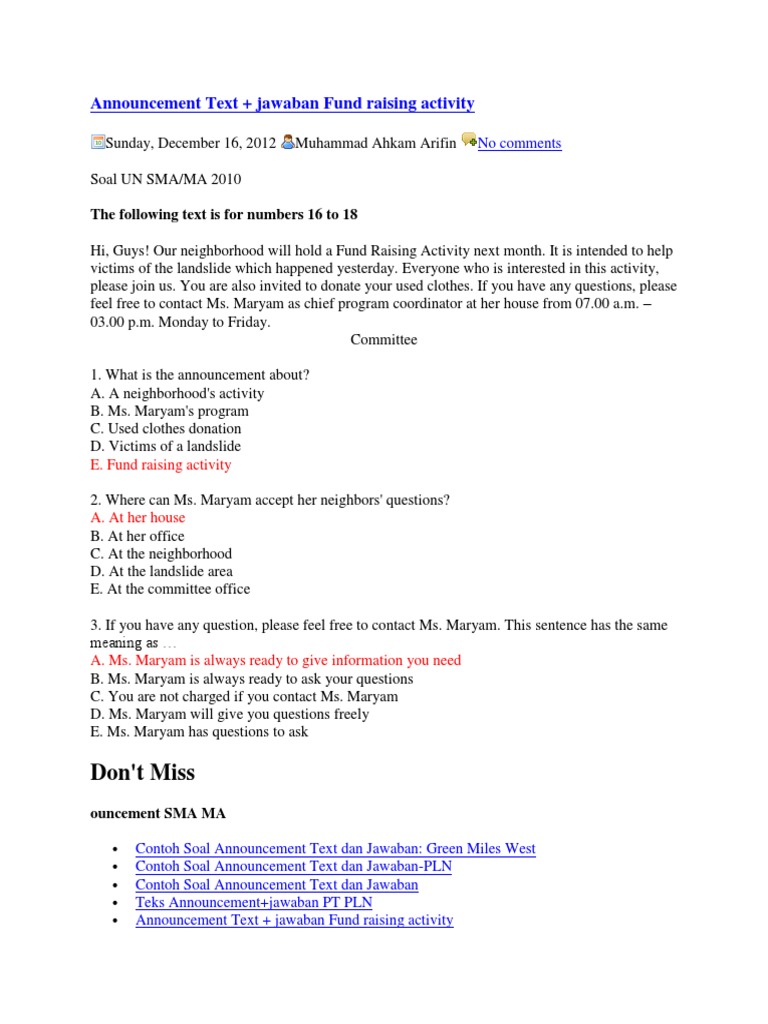 Dalam artikel ini saya akan membagikan 10 contoh soal announcement text dan kunci jawaban terbaru untuk pelajar sekolah menengah pertama kelas 7 8 atau 9 smpmts. 7 contoh soal bahasa inggris announcement kelas 1 sma pilihan ganda dilengkapi dengan kunci jawaban dan materi tentang pengumuman. Kemarin saya diminta oleh athyn untuk mencari sontoh soal pilihan ganda tentang announcement untuk dijadikan ajang latihan dalam rangka persiapan un tahun ini. We are announcing today that we are bringing the milestone and ever green brands even closer together. Every thursday from 1600 to 1700 at the school hall. They should be covered with non colorful wrapping plastic.