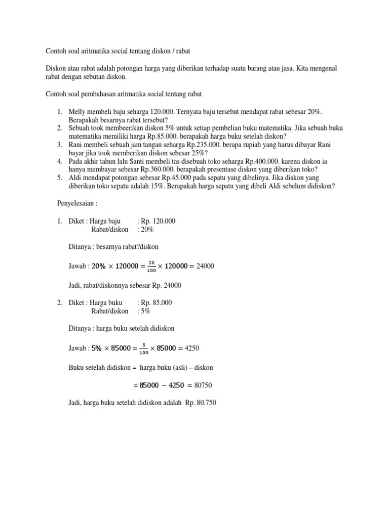 Mari kita bahas beberapa contoh soal tentang aritmatika sosial. Contoh soal deret aritmatika beserta jawabannya dan pembahasannya bisa untuk kelas 6 7 8 9 10 dan kelas 11 sd smp sma smk dan untuk tes kerja. Harga penjualan barang tersebut adalah. Contoh soal pembahasan aritmatika sosial tingkat smp. Berikut ini merupakan soal dan pembahasan mengenai aritmetika sosial yang dianjurkan untuk dipelajari oleh siswa tingkat smpsederajat terutama untuk menguatkan pemahaman konsep dan persiapan unbk. Aritmatika sosial berkaitan dengan masalah matematika yang sering kita temui dalam kehidupan sehari hari kita.