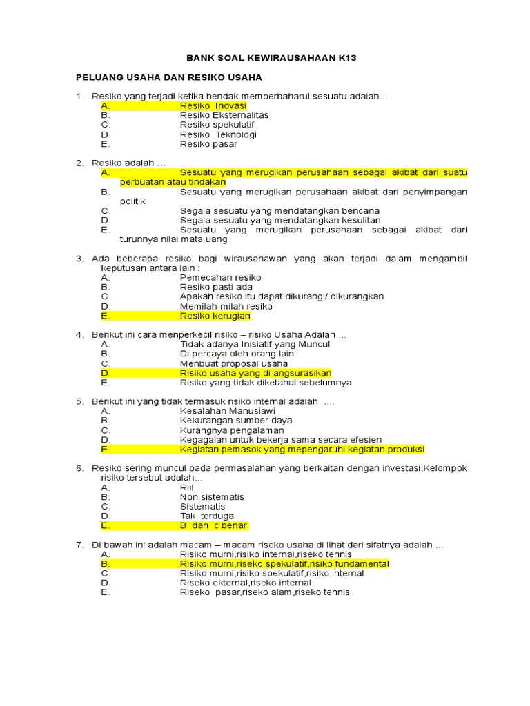 Contoh soal kewirausahaan kwu kelas 12 semester 1 dan semester 2 kurikulum 2013 untuk kisi kisi latihan soal uas mid semester berupa soal pilihan ganda dan. Entrepreneurship is the result of disciplined systematic process of applying creativity and innovations to needs and opportunities in the marketplace. Soal soal kewirausahaan dan jawabannya 1. Bep merupakan titik dimana pendapatan dari usaha sama. Smk negeri 3 tegal tahun diklat 2006 2007 no kunci no kunci no kunci 1 e 16 a 31 e 2 b 17 b 32 d 3 e 18 c 33 b 4 d 19 d 34 d 5 c 20 e 35 c 6 a 21 b 36 b 7 a 22 c 37 e. Biaya produksi harga jual dan banyaknya penjualan.