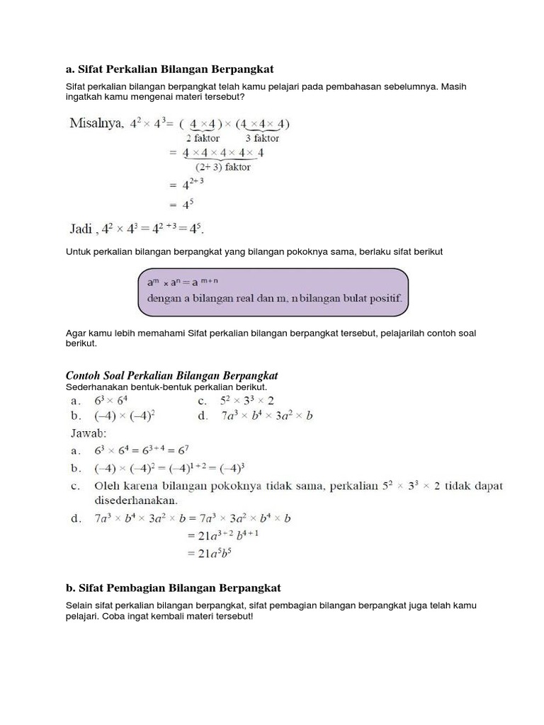 3x3x3x3x3 atau 7x7x7x7x perkalian bilangan bilangan dengan faktor faktor yang sama seperti ini biasa disebut sebagai perkalian berulang. Ke delapan sifat eksponen diatas harus kita pahami dan hafalkan karena sifat sifat eksponen tersebut adalah kunci untuk kita bisa mengerjakan soal soal eksponen. Bilangan berpangkat yang dimaksud dengan bilangan berpangkat ialah bilangan penyederhana dari bilangan yang dikalikanada beberapa sifat bilangan pangkat yang harus kamu tahu. Bagi anda anda yang tertarik untuk memahami tentang sifat sifat dari bilangan berpangkat bahkan sangat dianjurkan sebelum menjawab latihan soal di bawah ini anda dapat mengunjungi. Agar kamu lebih memahami kedua sifat tersebut di atas pelajarilah contoh soal berikut. Bilangan berpangkat adalah bilangan yang berfungsi untuk menyederhanakan penulisan dan penyebutan suatu bilangan yang memiliki faktor faktor perkalian yang sama.