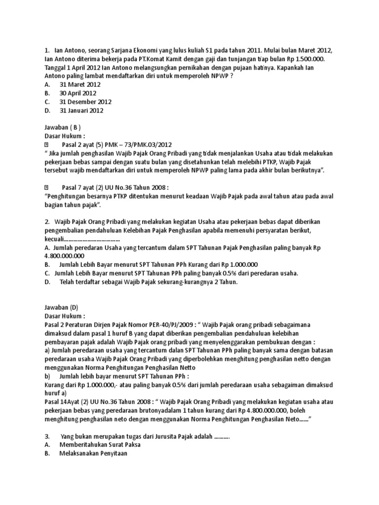 Contoh soal yang berkaitan dengan pajak penghasilan pph. Admin blog dapatkan contoh 2020 juga mengumpulkan gambar gambar lainnya terkait contoh soal brevet pajak dan jawabannya pdf dibawah ini. Beban pajak hendaknya sesuai dengan kemampuan wajib pajak c. Gragas merupakan pkp yang menjual elektronik di palembang. 700000 iuran tht tunjangan hari tua rp1000000 perbulan dan iuran pension sebesar rp700000 sebulan.