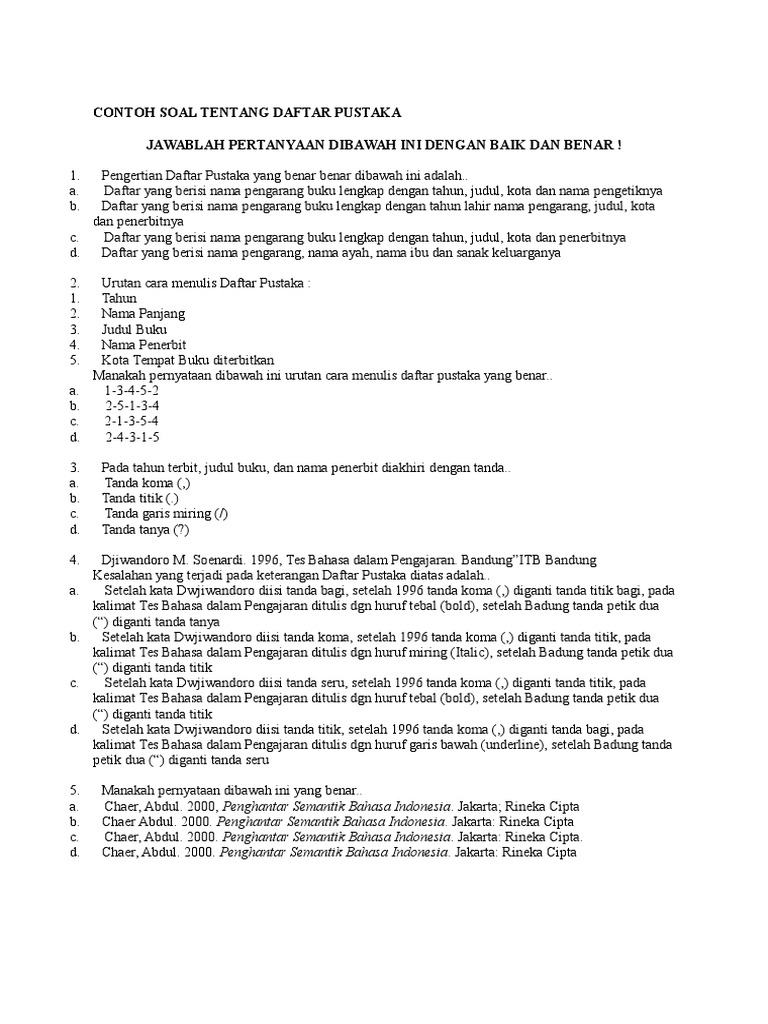 Contoh soal daftar pustaka. Tuntutan memberikan informasi dengan sumber yang benar hal inilah yang membuat penulisan daftar pustaka sangat diperlukan bahkan diwajibkan. Soal nomor 4 judul. Sekolah itu candu penulis. Daftar pustaka ada pada semua jenis karya tulis ilmiah seperti buku skripsi makalah artikel dan sebagainya. Yak pada kesempatan kali ini kita akan membahas tentang contoh daftar pustaka beserta pengertian fungsi dan aturan penulisannya. Ketika seseorang mengutip kalimat dari karya milik orang lain harus mencantumkan sumber asli bahan tulisannya.