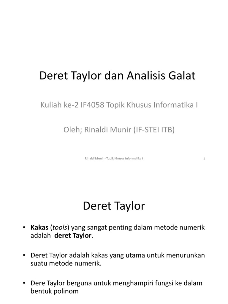 Soal ini dapat dikerjakan dengan penjabaran biasa yang sesungguhnya akan lebih efektif menggunakan formula deret taylor. Bab 2 deret taylor dan analisis galat 17 21 deret taylor kebanyakan dari metode metode numerik yang diturunkan didasarkan pada penghampiran fungsi ke dalam bentuk polinom.