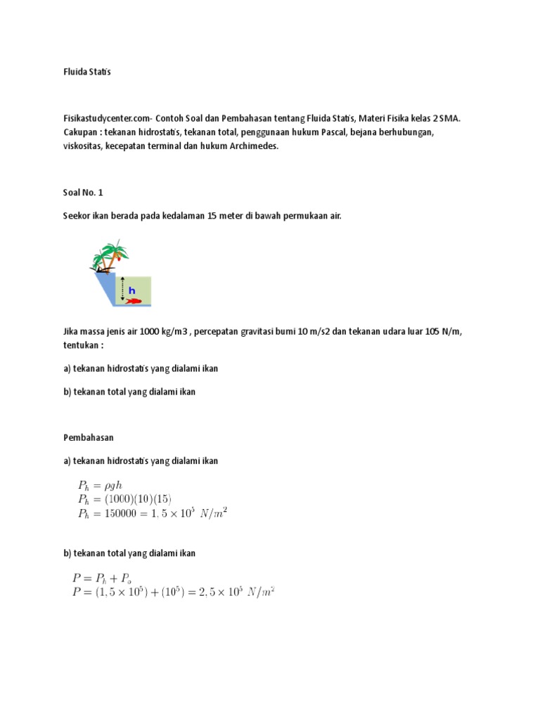 Download rangkuman contoh soal fluida statis kelas xi11 dalam bentuk pdf klik disini. Berikut ini terdapat beberapa contoh soal fluida statis terdiri atas. Pada pembahasan kali ini kami akan mengajak sahabat untuk mengupas tuntas materi ini lengkap dengan contoh soalnya. Apakah bola tersebut akan tenggelam atau mengapung ke permukaan air. Contoh soal fluida statis. Gaya archimedes yang bekerja pada benda saat dimasukkan ke dalam fluida ditentukan oleh.