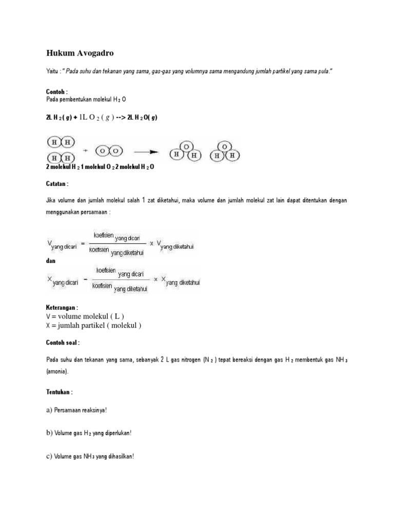 Pengertian rumus bunyi sejarah dan contoh soalnya. Berikut ini akan kami berikan contoh soal tentang hukum avogrado yang bisa anda pelajari. Contoh soal perhitungan kimia dengan menerapkan hukum atau hipotesis avogadro 1 reaksi n 2g 3 h 2g 2 nh 3g. Jika pada 1 liter gas n 2 terdapat n molekul hitunglah jumlah molekul h 2 yang bereaksi dan jumlah molekul nh 3 yang terbentuk jika reaksi berlangsung pada temperatur dan suhu yang sama. Hukum avogadro prinsip avogadro atau hipotes avogadro ialah hukum gas sesuai dengan ilmuwan italia amedeo avogadro yang pada tahun 1811 mengajukan hipotesis bahwasanya gas gas yang memiliki volume yang samatekanan yang sama dan pada temperatur yang sama memiliki jumlah partikel yang sama pula.