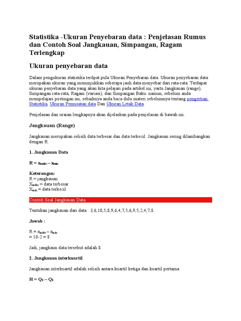 Atau dengan jak jangkauan antar kuartil k3 kuartil ke 3 k1 kuartil ke 1. Kuartil dan desil. Nilai standar z score misal kita mempunyai sebuah sampel berukuran n banyak datanya sama dengan n dan datanya x1 x2 x3 xn. Kemudian dari setiap data yang terbagi sama banyak tersebut dibatasi oleh sebuah nilai. Rata rata nya x dan simpangan bakunya. Jangkauan rentang adalah selisih antara nilai data terbesar dan nilai data terkecil.