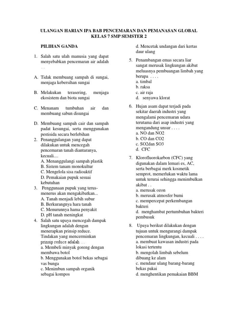 Untuk itu kali ini kami akan membagikan soal ipa kelas 7 tentang pemanasan global. Pemanasan global meberikan banyak dampak negatif bagi mahluk hidup yang ada dibumi baik itu manusia hewan maupun tumbuhan.