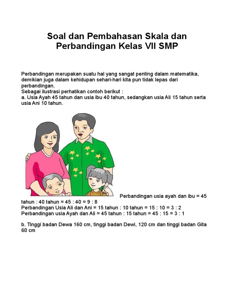 Contoh soal perbandingan skala. Contoh soal dan pembahasan jawaban perbandingan dan skala materi ulangan harian matematika kelas 7 smp mencakup perbandingan senilai perbandingan berbalik nilai dan menentukan jarak pada peta berdasarkan skala yang diberikan. Contoh soal perbandingan ini disusun dalam bentuk pilihan berganda dilengkapi dengan pembahasan dan dirancang berdasarkan beberapa subtopik yang paling sering keluar dalam kajian perbandingan untuk tingkat menengah pertama. Contoh soal perbandingan dan skala pilihan ganda berikut ini kami telah merangkum contoh soal perbandingan dan skala beserta penyelesaiannya untuk siswa dari berbagai penerbit buku yang berjumlah 20 butirdalam membantu mutu pendidikan di indonesia kami selalu berkontribusi agar dapat siswa belajar dan paham hitungan soal. Skala masalah jarak peta jarak sebenarnya. Postingan kali ini membahas tentang contoh soal dan pembahasan perbandingan dan skala akan tetapi contoh soal dan pembahasan perbandingan dan skala ini untuk kelas 5 sd atau untuk sekolah dasar kelas 5. Perbandingan matematika dapat dibagi menjadi 2 yakni perbandingan senilai dan perbandingan berbalik nilai.