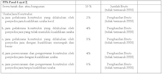 Rp50000000 x 4 rp2000000. Karena sifatnya final maka penghasilan dan pajak atas jasa konstruksi ini tidak dimasukkan dalam. Besarnya pemotongan pph pasal 4 ayat 2 atas penghasilan dari usaha jasa konstruksi adalah 3 x rp5000000000 rp150000000. Tarif pph pasal 4 ayat 2pph final terbaru untuk masing masing objek pajaknya bervariasi dan bersifat final. Karena bersifat final pemotongan pajak ini tidak dapat dikreditkan. Pada pasal 4 ayat 2 huruf d disebutkan dengan jelas bahwa yang digunakan adalah frasa usaha jasa konstruksi.
