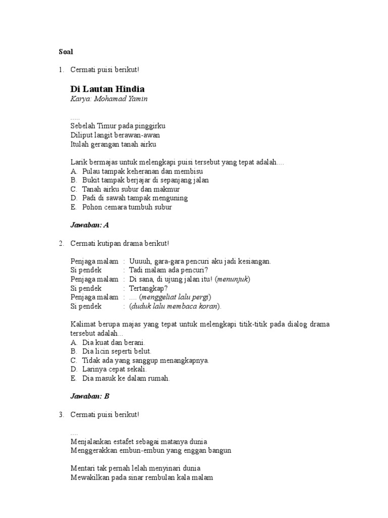 Contoh soal puisi beserta jawabannya. Sebelumnya kita sudah membahas tentang majas dalam puisi rhyme atau sajak dan beberapa contoh puisi dalam bahasa inggris. 80 contoh soal teks anekdot pilihan ganda dan jawabannya demikianlah pertanyaan dan jawaban tentang teks cerpen. Semoga apa yang sudah disampaikan dapat bermanfaat dan dapat dijadikan bahan belajar bahasa inggris sobat ibi semua. Contoh soal pilihan ganda pg ulangan harian materi puisi kelas 8 prediksi soal unbk smk 2019 beserta kunci jawabannya itulah yang admin bisa dapat mengenai soal dan jawaban tentang puisi kelas 10. Soal puisi bahasa indonesia dan jawabannya kumpulan model soal ujian nasional tentang puisikarya sastra m enurut wikipedia bahasa indonesia puisi a dalah seni tertulis di mana bahasa digunakan untuk kualitas estetiknya untuk tambahan atau selain arti semantiknya. Demikian materi pada kesempatan kali ini yaitu penjelasan tentang contoh kisi kisi soal bahasa inggris sbmptn beserta kunci jawabannya.