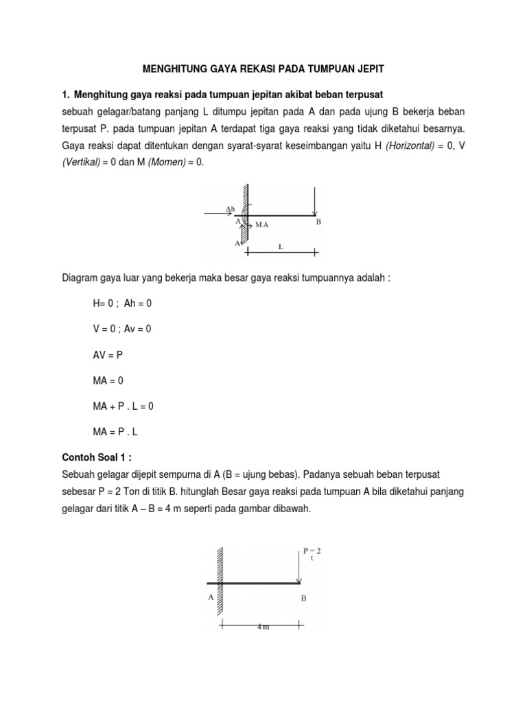 Contoh soal tumpuan jepit. Contoh soal mekanika teknik balok kantilever tumpuan. Seperti yang kita bahas pada kata pengantar statika 1. Tumpuan jepit tumpuan jepit bisa dikonstruksikan seperti misalnya balok yang ditanam dalam tembokkan atau sebagai tumpuan pada balok terusan jepitan elastis. Tumpuan juga dikatakan dengan landasan dimana sebuah balok akan diletakkan kepadanya. Soal tersebut dapat diselesaikan dengan cara di bawah. Tumpuan jepit yang ketiga adalah tumpuan jepit dimana tumpuan jepit ini lebih kompleks lagi yaitu ia bisa menerima baik itu gaya horizontal vertical dan juga ia bisa menerima momen.