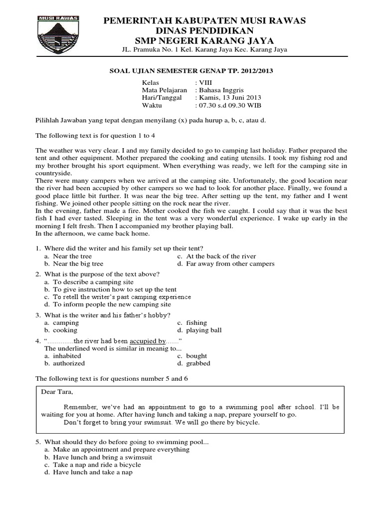 For number 1 to 3 date. Berikut contoh soal latihan online pat ukk uas matematika kelas viii 8 smp tahun 2020 tahun pelajaran 20192020. Contoh soal ukk bahasa inggris kelas 8 smp ukk. Hai sobat kali ini kami membahas artikel soal bahasa inggris kelas 8 smpmts tahun 2020 2021 lengkap soal pg essay unutk kurikulum 2021 pelajaran ibi semester 1 dan 2. Dalam rangka milad muhammadiyah smp muhammadiyah 1 dayeuhluhur akan mengadakan lomba kebersihan antar kelas. Choerulhuda 19 mei 2015 1936.
