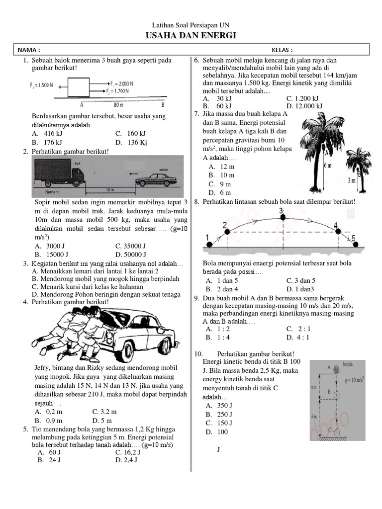 Home usaha dan energi soal dan pembahasan usaha dan energi. Ek 1 2 m v 2 ek 1 2 x 40 x 10 2 ek 2000 joule soal no. Contoh soal dan pembahasan usaha dan energi by jendela ilmu 8 nov 2016 11 comments bank soal fisika kelas xi sma berikut ini beberapa contoh soal dan pembahasan mengenai usaha energi kinetik energi potensial hubungan antara usaha dan energi kinetik hubungan usaha dan energi potensial dan energi mekanik. Rangkuman materi dan contoh soal fisika 16 sbmptn 14 modul praktikum fisika sma 11. Soal dan pembahasan usaha dan energi sma suaragumam november 27 2016. Kumpulan soal dan pembahasn tentang usaha dan energi untuk smp.