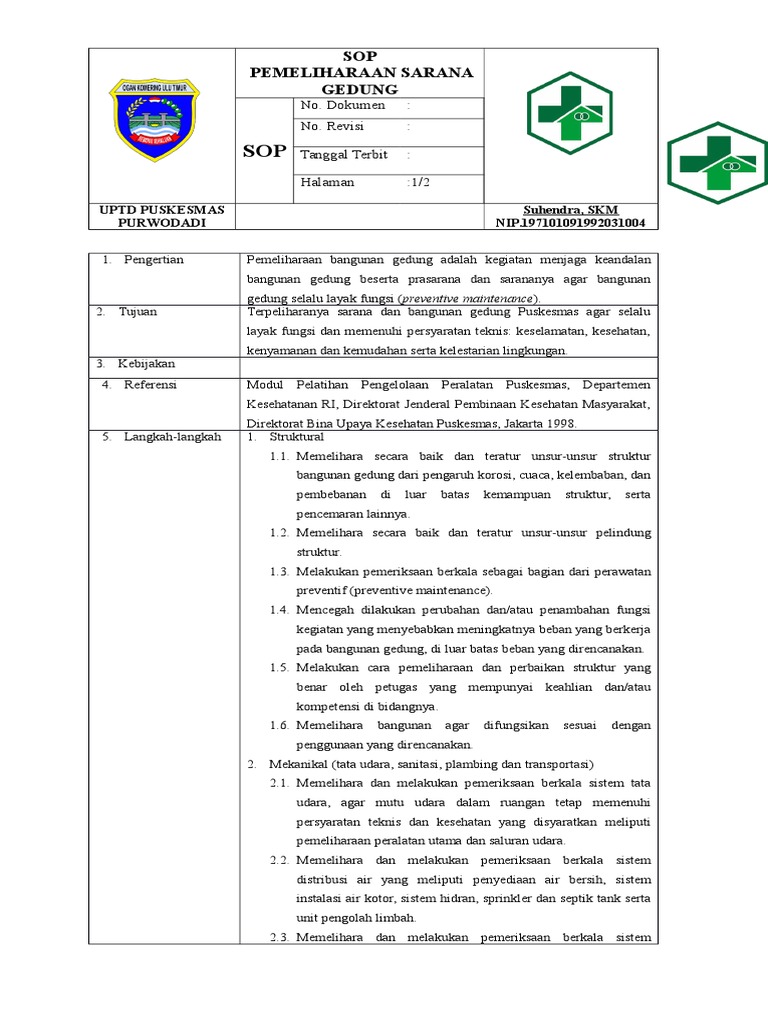 Berikut ini adalah contoh dari sop pelaksanaan smd atau survey mawas diri yang biasanya diminta di bab 5. Gedung bangunan laboratorium lapang kandang ternak greenhouse kolam percobaan dll pagar gapura monument menara dll. Sop pemeliharaan sarana gedung ruangan tyanstory. Lingkup pemeliharaan bangunan gedung 13 a. Dalam pelaksanaannya pemeliharaan sarana juga sangat diperhatikan untuk kelancaran pekerjaan di puskesmas. 0757 2 comments admen bab 2 download sop.
