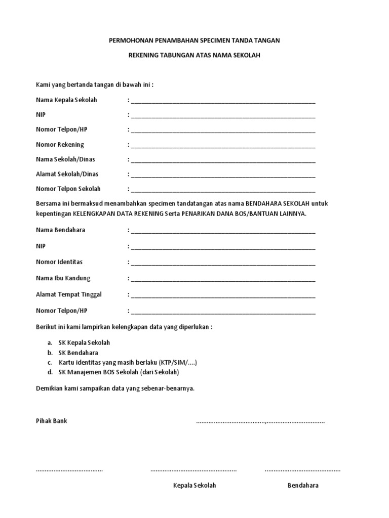 Cicita soft share to. Untuk mengganti specimen atau tanda tangan tersebut perlu adanya surat permohonan pergantian specimen dari gampong yang bersangkutan. File download contoh format specimen tanda tangan kepala sekolahmadrasah pada link di atas yang bisa anda download ini disimpan di cloud storage google drive untuk menjamin keamanan file dari virus atau malware file otomastis melewati proses scan anti virus oleh sistem google drive. Seperti yang telah saya sampaikan pada artikel sebelumnya bahwa saya akan juga membagian contoh format surat perubahan spesimen. Contoh surat permohonan sponsorship 1. Contoh surat permohonan sponsor gathering 1.