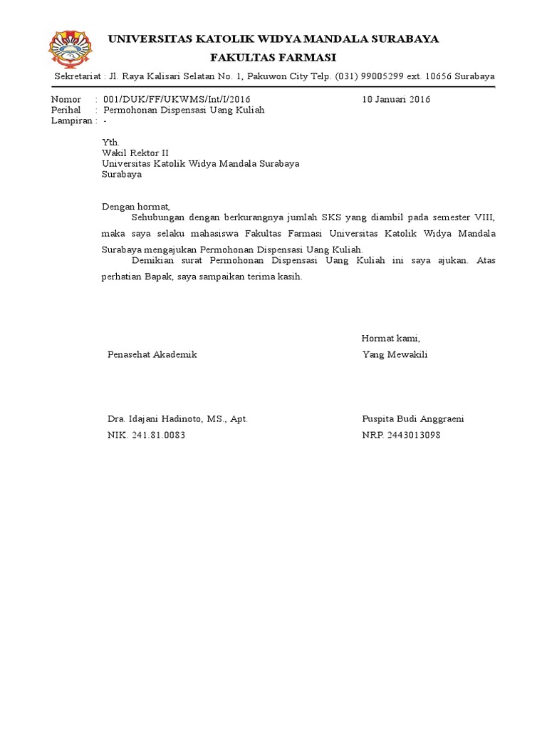 Contoh surat dispensasi kuliah. Berdasar dari hal tersebut maka kita bisa menyimpulkan tujuan dari surat dispensasi yakni untuk memberikan keringanan atas tanggung jawab yang seharunya kita kerjakan atau kita jalankan. Dalam rangka acara rapat koordinasi pemilihan umum raya. Contoh surat dispensasi definisi format surat dispensasi kuliah dan organisasi surat dispensasi merupakan surat yang berisi alasan si pemohon atau pembuat surat karena tidak bisa melakukan kegiatan atau aktivitas tertentu dikarenakan ada hal lain yang harus diselesaikan. Di bawah ini adalah contoh surat dispensasi kuliah untuk keterlambatan pembayaran spp yang biasa dipergunakan. Contoh surat dispensasi kuliah mahasiswapedia 951 pm. Dalam mengajukan permohonan dispensasi pembayaran spp kuliah maka tentu anda harus memiliki alasan yang jelas dan kuat serta bisa diterima oleh pihak kampus.