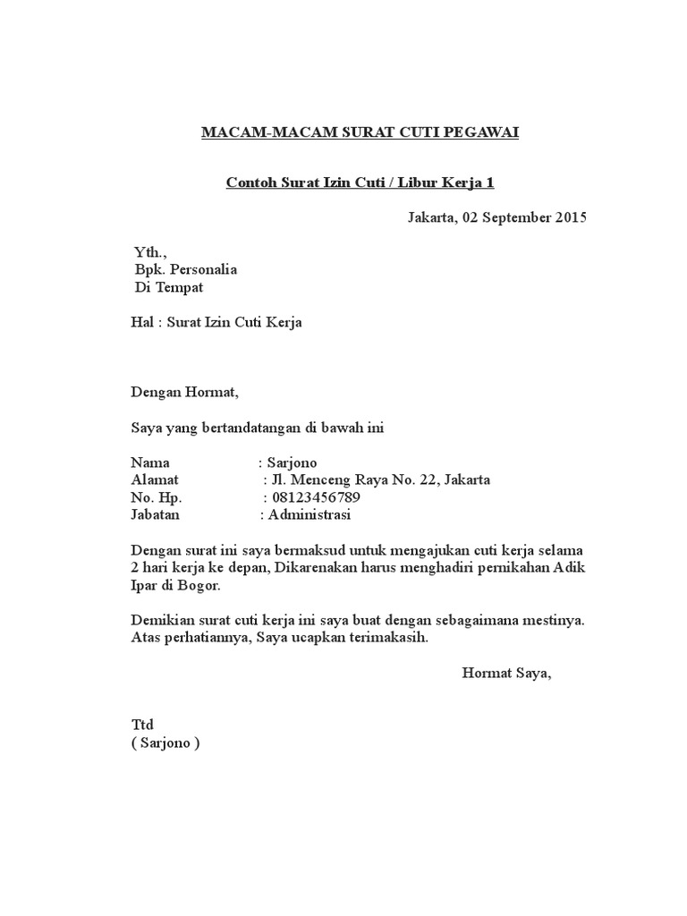 Surat izin tidak masuk kerja adalah surat izin yang dibuat oleh seorang karyawan suatu perusahaan atau instansi yang ditujukan kepada atasannya yang berisi permohonan izin untuk tidak masuk kerja karena alasan tertentu misalnya karena alasan keluarga yang tidak bisa di tinggalkan misalnya ada anggota keluarga yang meninggal dunia atau musibah lainnya karena sakit karena mau menikah dan. 15 contoh surat permohonan cuti paling lengkap jika anda seorang karyawan perusahaan pegawai negeri sipil atau bahkan mahasiswa tentunya tidak asing lagi dengan surat cuti.