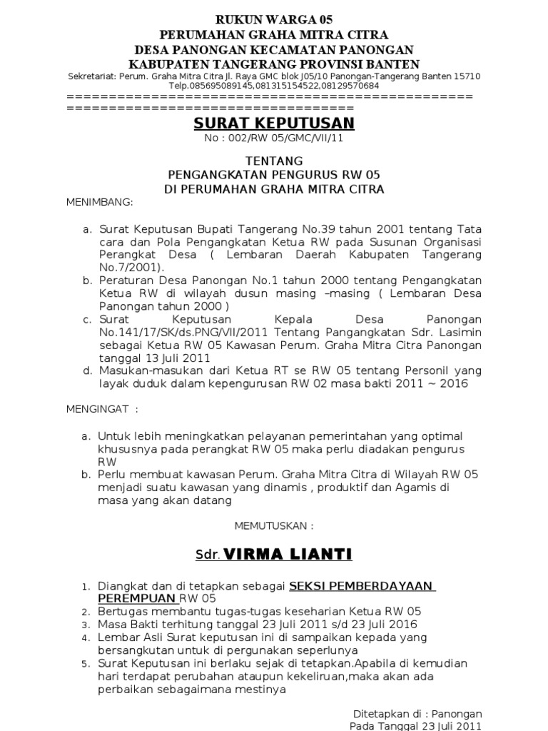 Rapat tim formatur dan mid formatur setelah. Bahwa pengangkatan pengurus lembaga pemberdayaan masyarakat lpm tahun 2018 dimaksud perlu ditetapkan dengan keputusan kepala desa mataiwoi kecamatan mowila. Download contoh sk pengurus majelis taklim. Maka pelu adanya surat keputusan yang mengatur pergantian kepengurusan organisasi santri pondok pesantren asshiddiqiyah ii tangerang. Untuk anda para pengelola lembaga pendidikan anak usia dini paud mungkin contoh surat pengangkatan pengurus dan tenaga pengajar pendidikan paud berikut ini bisa dijadikan referensi untuk membuat surat pengangkatan ketika menambah tenaga pengajar baru. Surat keputusan diperlukan bilamana seorang pemimpin atau atasan membuat keputusan di suatu pihak atau kelompok.