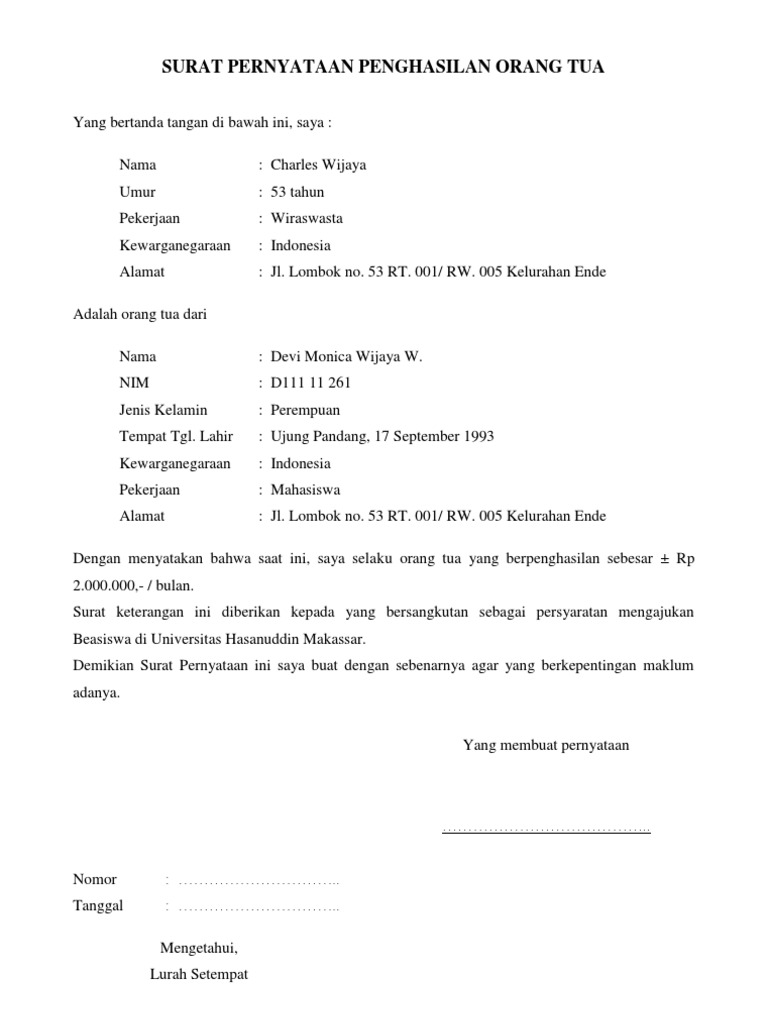 Admin blog kumpulan surat penting juga mengumpulkan gambar gambar lainnya terkait contoh surat keterangan gaji orang tua dari kelurahan dibawah ini. Contoh surat pernyataan penghasilan orang tua ini biasanya digunakan oleh pelajarmahasiswa untuk mengajukan beasiswa. Misalnya untuk pendaftaran sekolah atau permohonan beasiswa. Surat ini kadang dipergunakan untuk beragam hal. Ada banyak jenis dan contoh surat keterangan penghasilan. Pengaju dari surat keterangan penghasilan memang perlu dicantumkan pada suratnya.