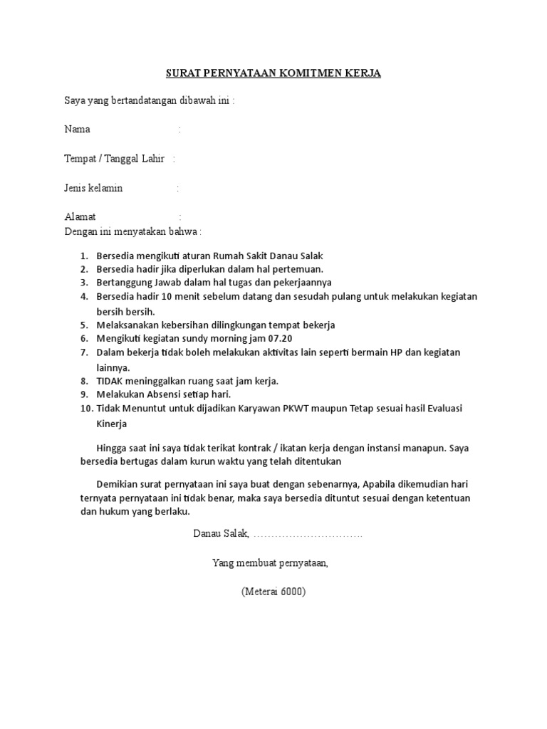 Contoh surat komitmen kerja. Hallo sobat sharing pada kesempatan ini saya akan menyajikan banyak contoh surat pernyataan kerja kesanggupan sikap belum menikah dll beserta format dan cara penyusunannyakamu pasti sedang membutuhkannya. Contoh surat perjanjian no. Yang bertanda tangan dibawah ini. Surat perjanjian kerja paruh waktu. Namun untuk urusan komunikasi perusahaan maupun berbagai lembaga maupun instansi pemerintah penggunaan surat masih merupakan sesuatu hal yang wajib untuk dilakoni. Bangga dan senantiasa memandang perusahaan secara positif di situasi apapun.