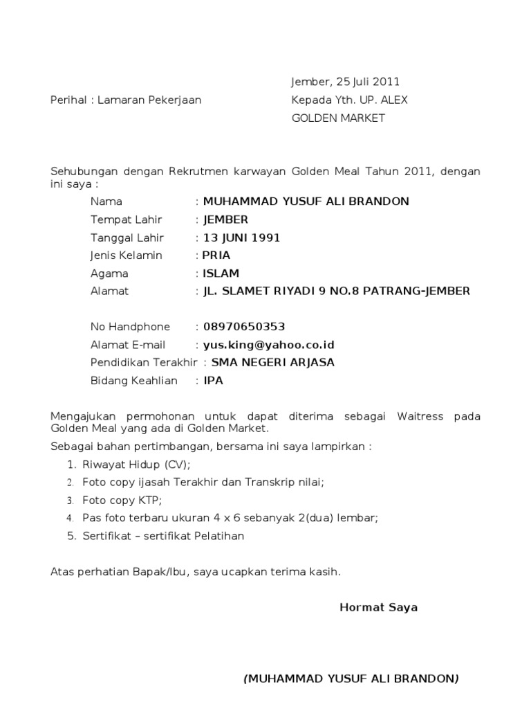 Contoh surat lamaran waiterwaitress contoh surat untuk lamaran kerja cv surat pernyataan permohonan pengantar kerja umum keterangan. Contoh surat lamaran kerja adalah suatu hal yang sangat dibutuhkan oleh para orang yang sedang mencari pekerjaan yang sesuai dengan keinginannya.