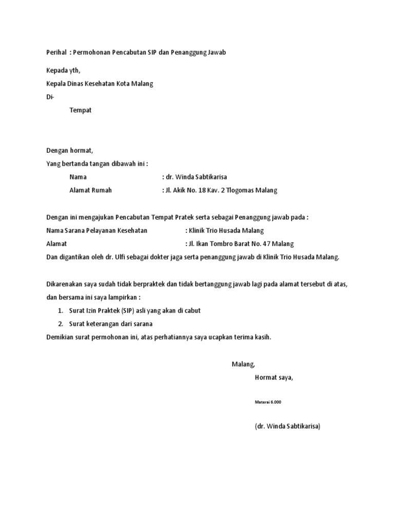 Surat keterangan dari pimpinan fasyankes sebagai tempat praktiknya. Surat permohonan pencabutan sip yang ditandatangani di atas materai rp. Bekasi 4 mei 2017 hormat saya dr. Data sarana prasarana tempat praktik bagi yang praktik mandiriperseorangan. Semoga apa yang admin sajikan bisa menjadi acuan dan referensi bagi anda yang membutuhkan contoh surat seperti di atas. Klik tulisan download kecil dibawah tulisan.