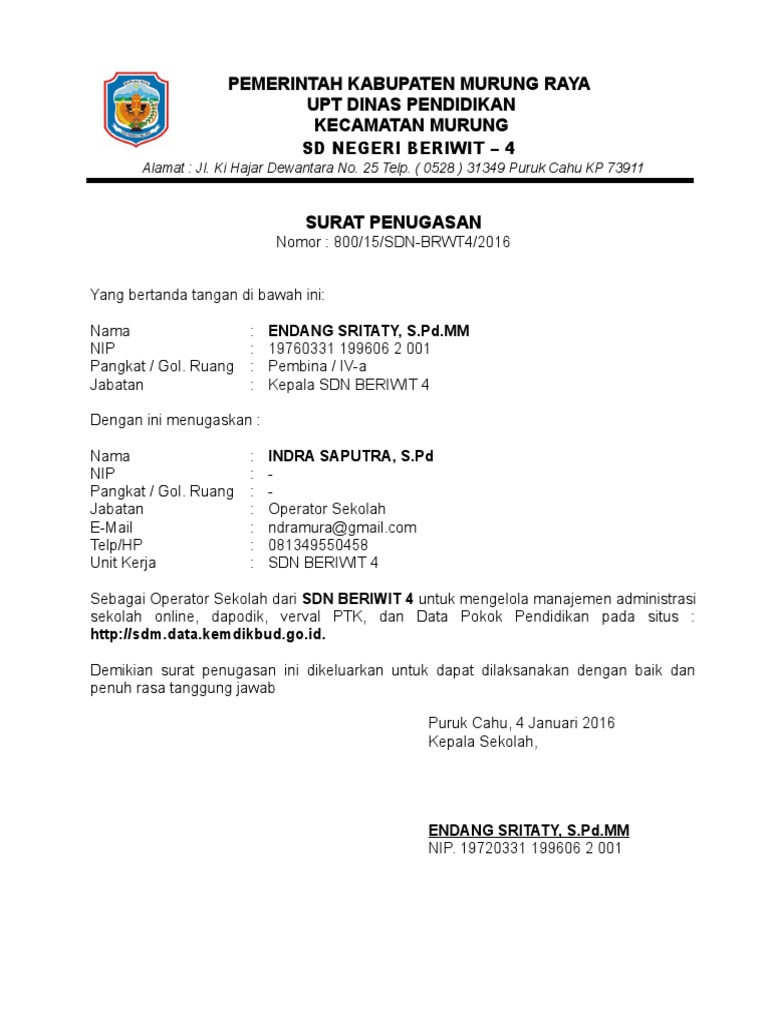 Contoh surat penugasan operator sekolah. Berikut contoh sk suratkeputusan pengangkatan operator sekolah yang bisa menjadi contoh. Contoh sk operator dapodik sekolah sd smp sma smk 2017 ini merupakan salah satu surat keputusan kepala sekolah khususnya dalam pengangkatan dan penugasan operator sekolah. Rekan rekan operator sekolah yang belum berhasil login pada verval pd 2014 silahkan lakukan registrasi sebagai operator sekolah pada situs pengelolaan data di sdm pdsp. 15 contoh surat tugas resmi yang baik dan paling lengkap salah satu jenis surat yang sangat sering digunakan oleh perusahaan maupun instansi tertentu adalah surat tugas. Selain itu di beberapa sekolah terutama sekolah pelosok atau daerah belum tentu ada ptk yang menguasai iptek komputer dan internet maka kepala sekolah seyogyanya mengangkat tenaga operator sekolah untuk tugas tugas data kependidikan. Contoh surat sk dan surat penugasan operator sekolah paudtk seperti biasa seorang operator sekolah harus menguploud data perbaikan atau memperbaharui surat sk dan surat tugas operator pada layanan halaman sdm pdspk.