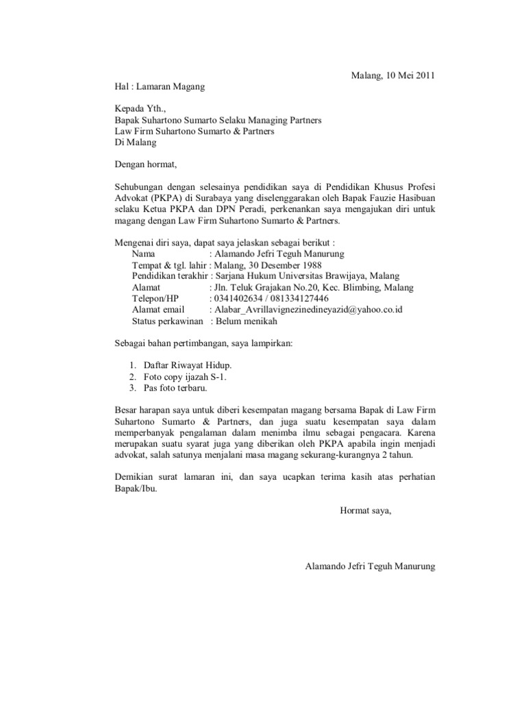 Contoh surat permohonan magang pribadi. 17 juli 2014 demikian surat permohonan magang ini saya buat atas perhatian dan kerjasamanya saya sampaikan terimakasih. Surat permohonan magang lampiran. Semarang 24 juni 2014 hormat saya muhammad salim 2. Permohonan magang kerja lampiran.