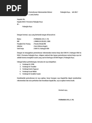 Contoh surat permohonan mutasi guru. Berikut ini dokumen dokumen permohonan mutasi yang harus dilengkapi guru. Contoh surat permohonan mutasi. Untuk setiap instansi mungkin berbeda beda namun pada umumnya harus melampirkan fotocopy sk fotocopy karu pegawai fotocopy ijazah terakhir fotocopy absensi riwayat hidup bahkan surat rekomendasi. Menulis surat permohonan pindah tugas tidaklah terlalu susah. Contoh surat permohonan mutasi kerja bekerja disuatu lembaga atau perusahaan terkadang memaksa kita untuk siap ditempatkan dilokasi tertentu. Akhirnya kami kembali melakukan konsultasi untuk memperoleh informasi syarat syarat yang diperlukan untuk proses mutasi ini.