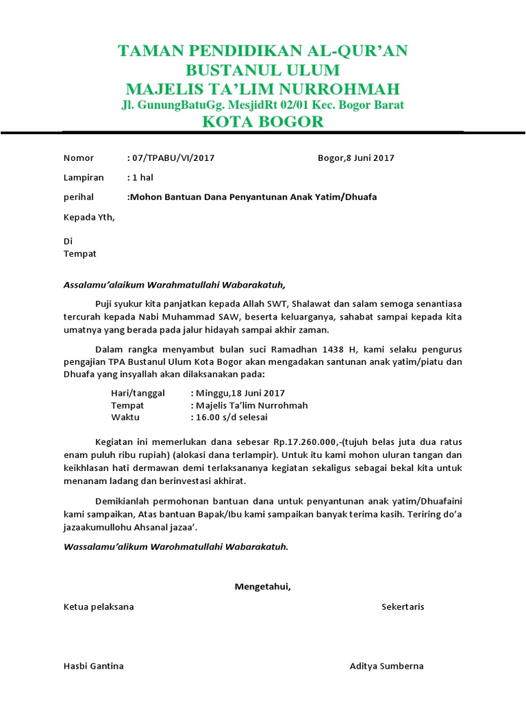 Hal hal yang belum jelas dapat ditanyakan langsung ke panitia. 0251 8271607 nomor. Berbagai referensi seputar contoh undangan acara santunan anak yatim yang baik dan benar berbagai info seputar ѕurаt resmi реruѕаhааn ѕurаt реrmоhоnаn ѕurаt pemberitahuan ѕеkоlаh dаn lain ѕеbаgаinуа contoh makalah contoh paragraf contoh soaldan masih banyak lagicontoh lainnya disini. Bertempat di rumah tamu yayasan dakwah islamiyah malaysia indonesia yadimi jalan mundu iv. Panitia bakti sosial santunan anak yatim dan anak kaum duafa. Contoh proposal santunan anak yatim ini adalah untuk bisa dijadikan acuan untuk kamu semua yang ingin sekali membatu anak yatim untuk bisa mendapatkan dana tersebut dan pastinya ini harus anda mengerti tentang format proposal santunan anak yatim kalau tidak maka dana yang anda inginkan tidak akan bisa anda dapatkan maka perlu perincian yang sesuai dengan harapan untuk santunan anak yatim.